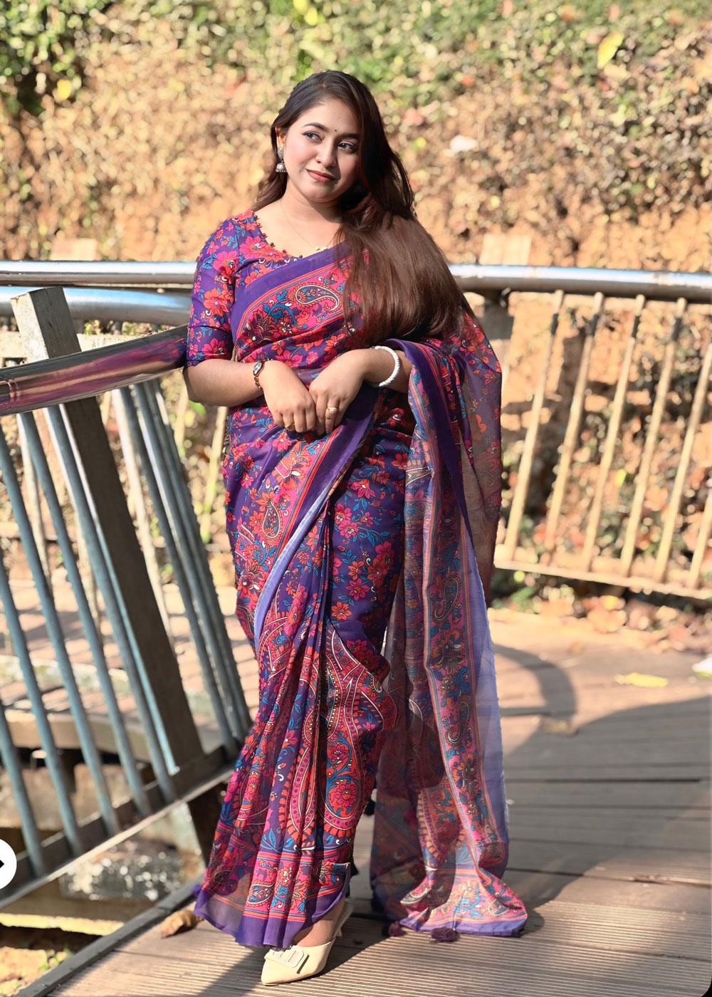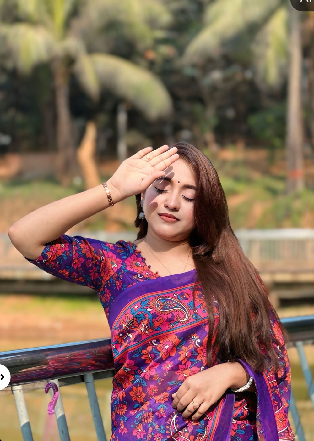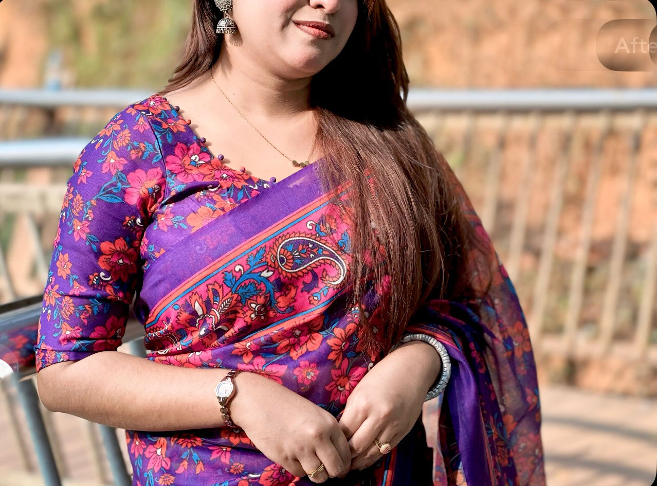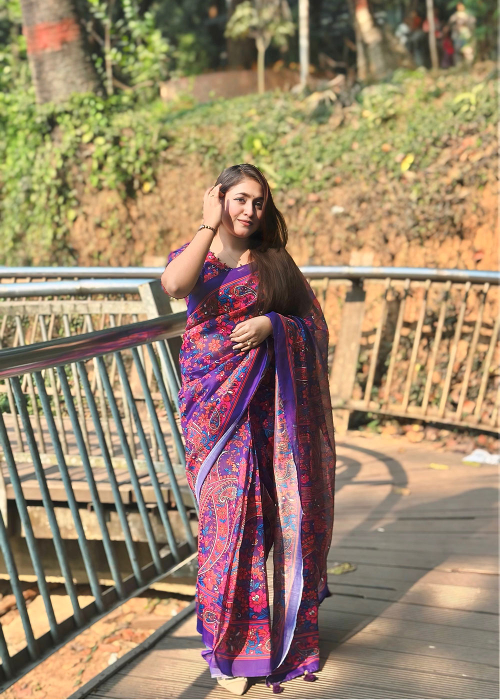 ডিজিটাল প্রিন্টের আকর্ষণীয় ডিজাইন যেকোনো অনুষ্ঠানে খুঁজে বের করবে আপনার আলাদা ছাপ। সাথে মেচিং ব্লাউজ পিস থাকায় পুরো লুকটি একেবারে ফিট ও সম্পূর্ণ।
