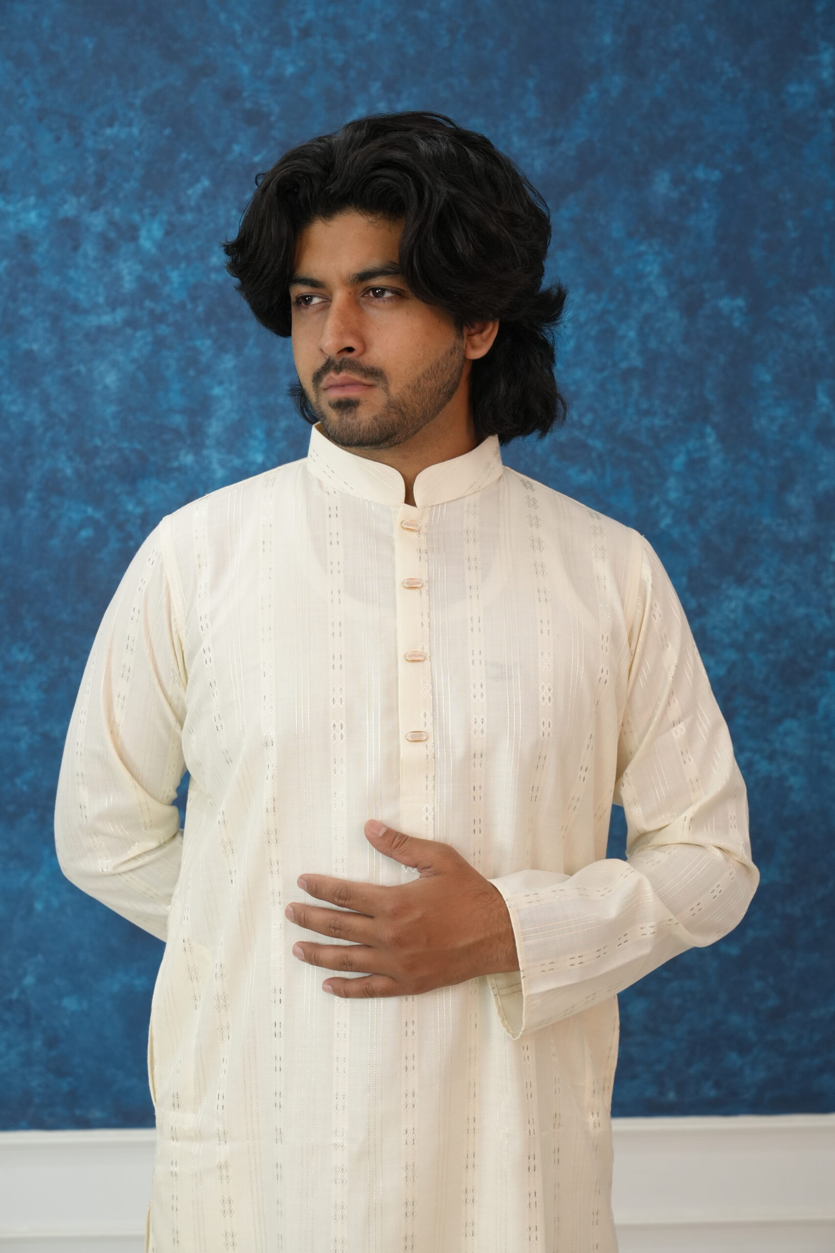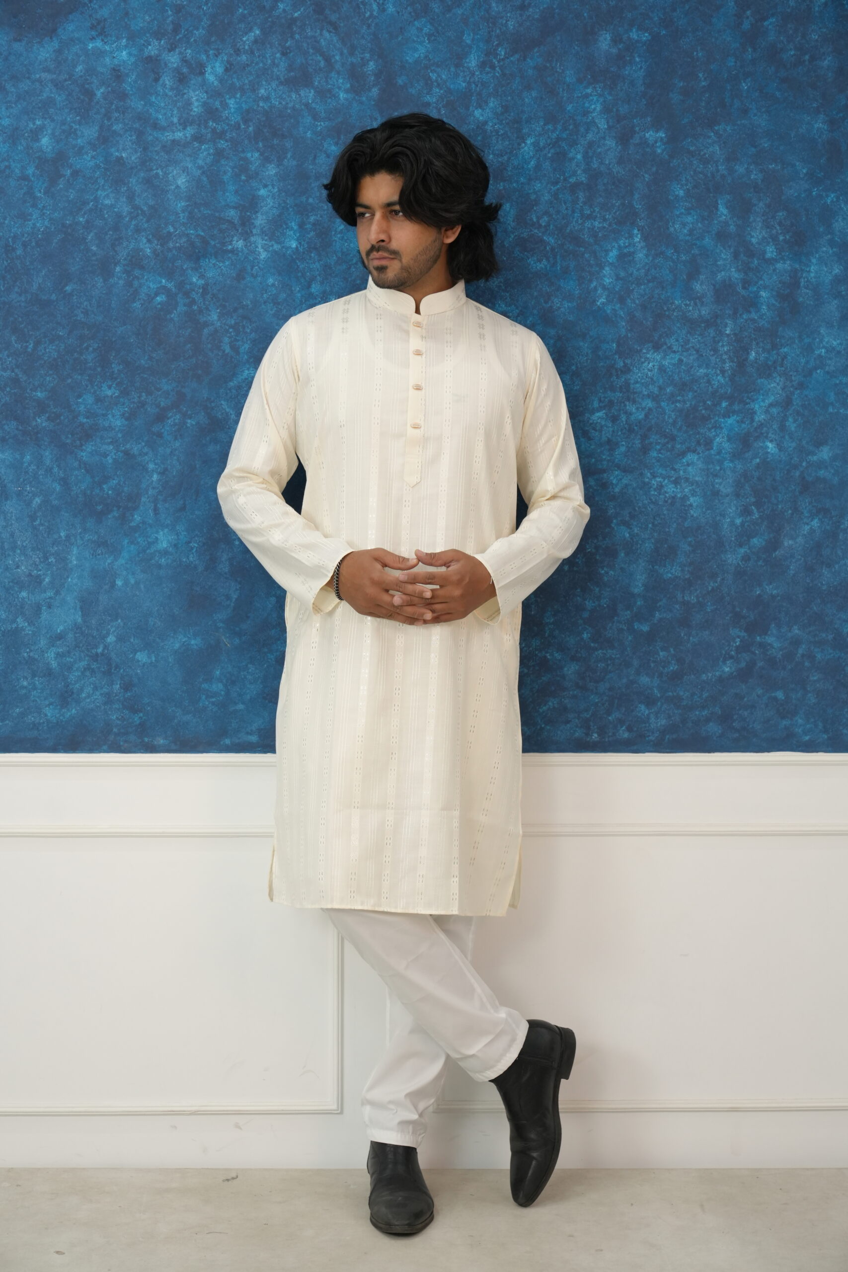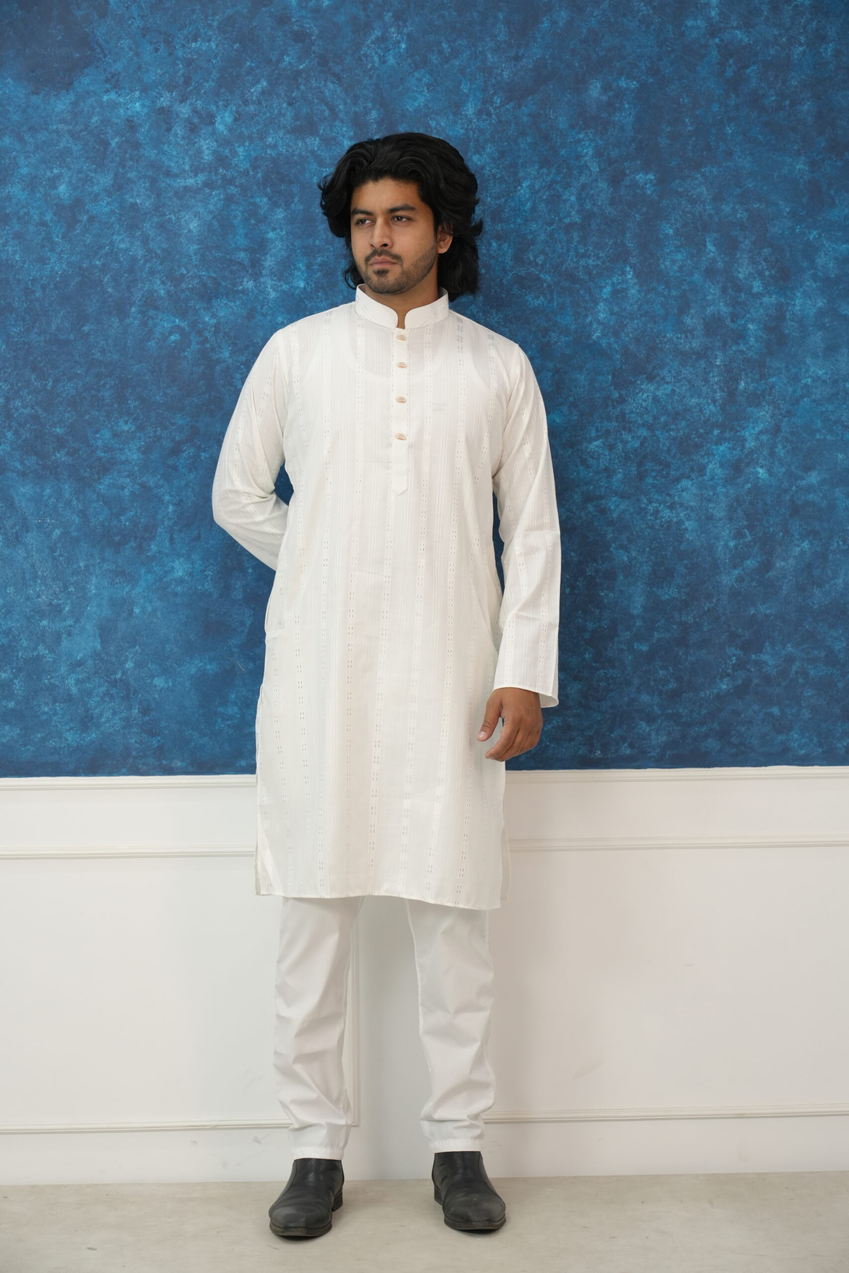 Elevate your ethnic wardrobe with this masterfully crafted Ivory Panjabi, designed for the man who appreciates a blend of traditional roots and modern sophistication. Whether it’s an Eid celebration, a wedding ceremony, or a festive evening, this piece ensures you stand out with effortless grace.