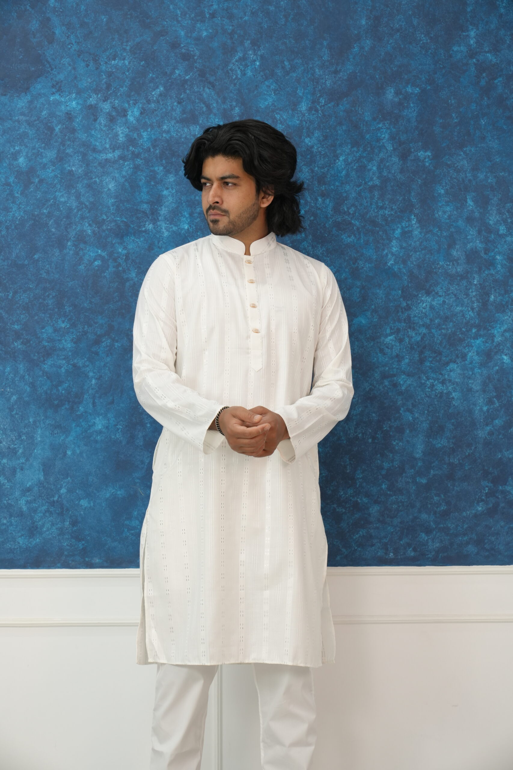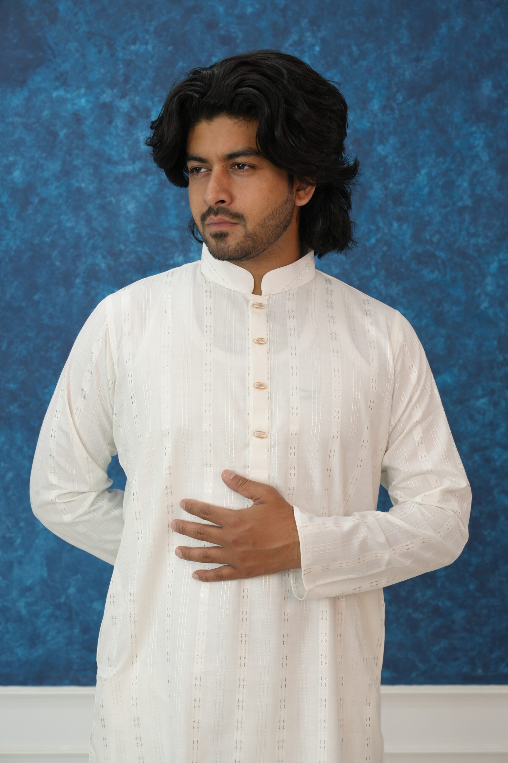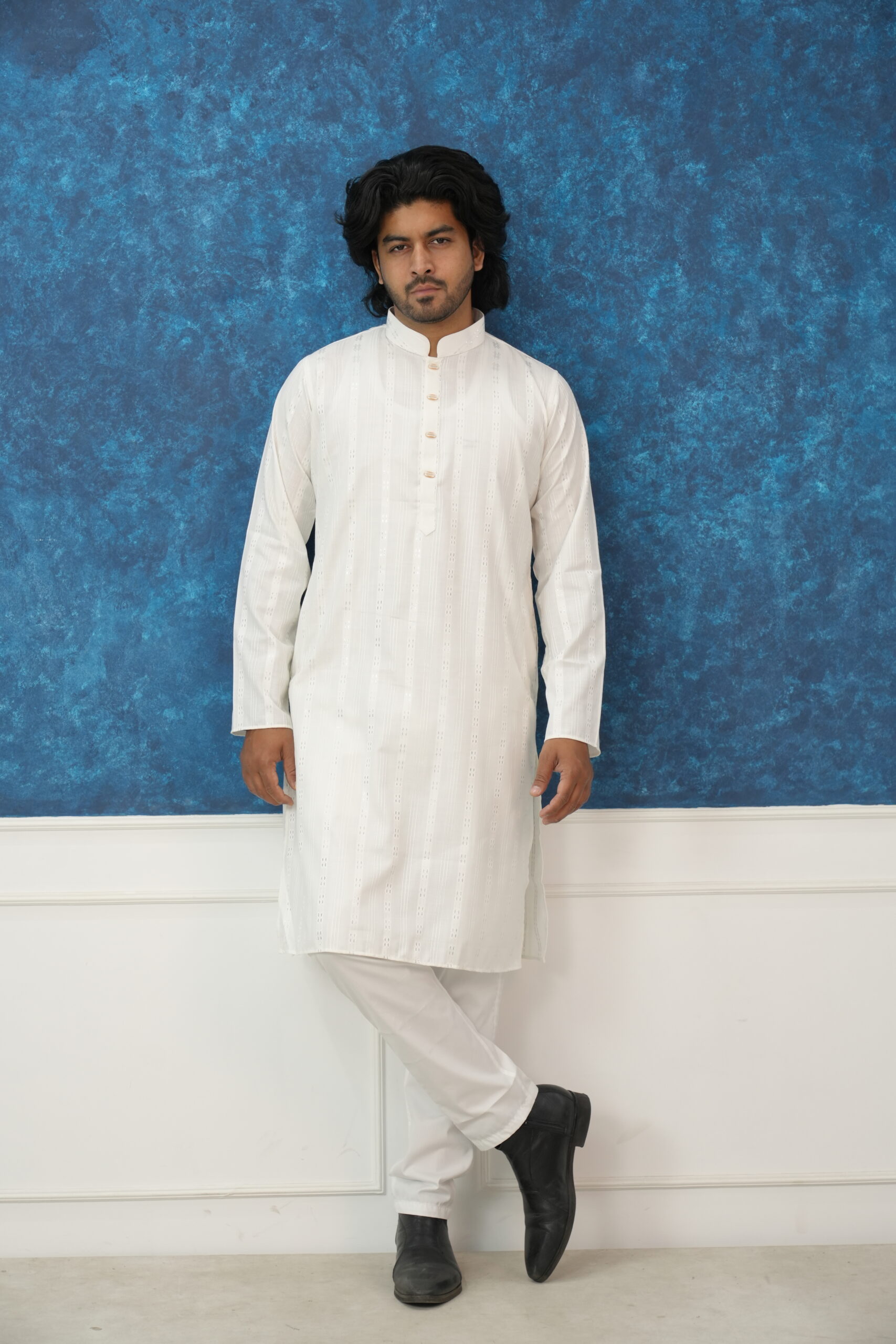 Elevate your ethnic wardrobe with this masterfully crafted Ivory Panjabi, designed for the man who appreciates a blend of traditional roots and modern sophistication. Whether it’s an Eid celebration, a wedding ceremony, or a festive evening, this piece ensures you stand out with effortless grace.
