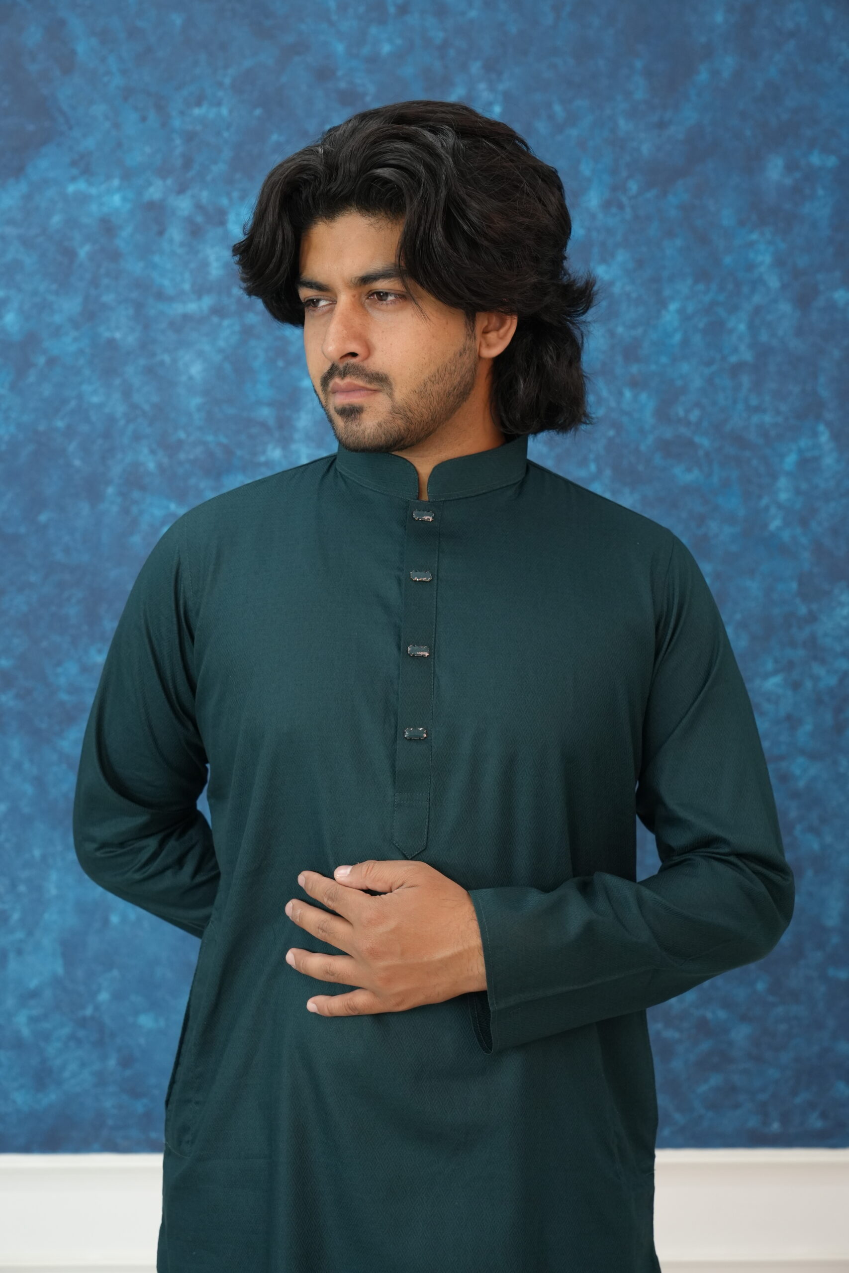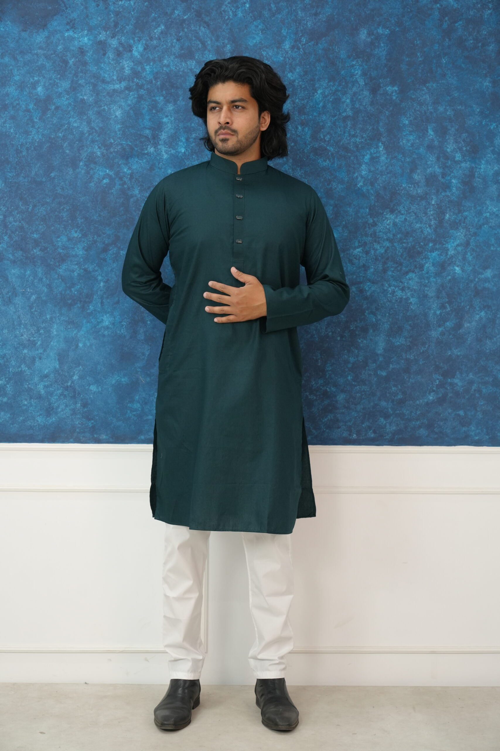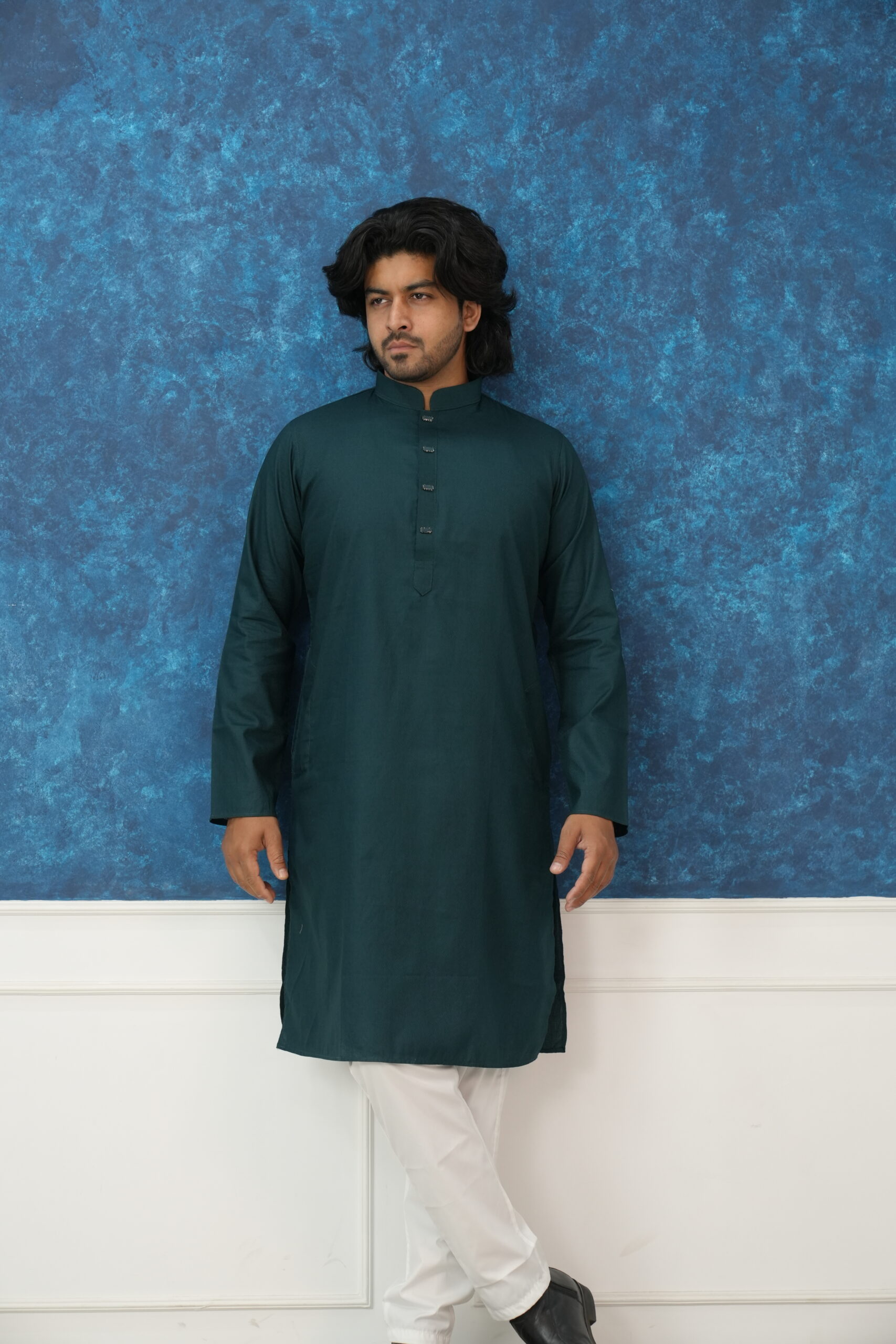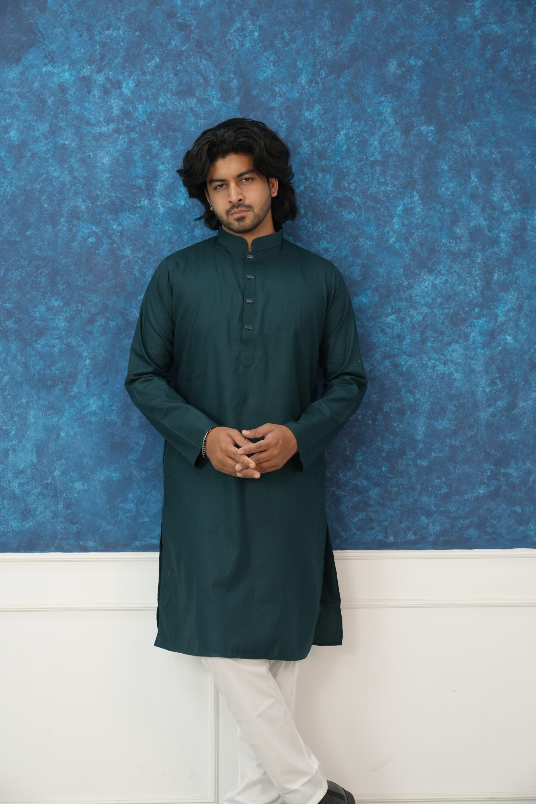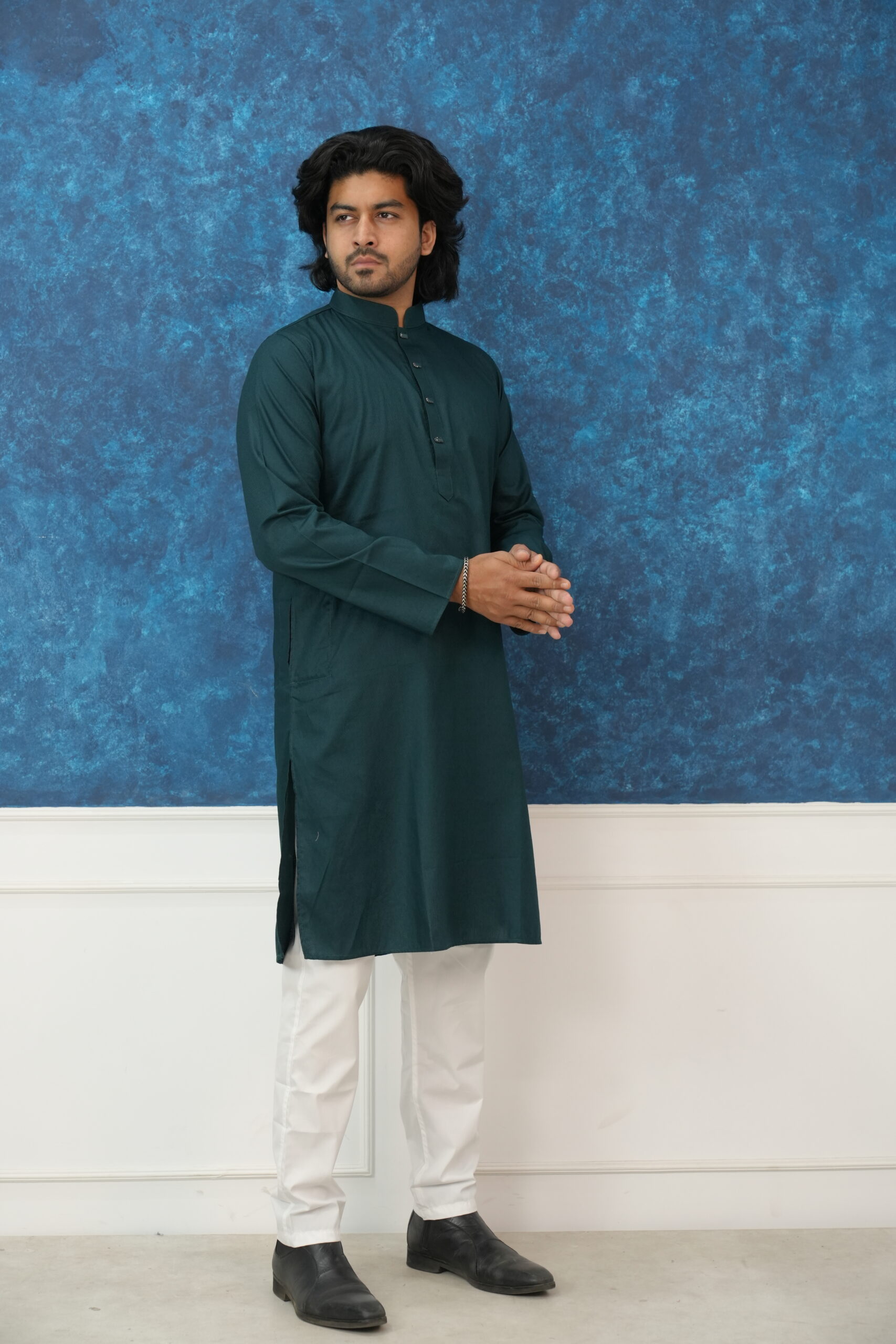 This dark green kurta offers a sophisticated blend of traditional South Asian heritage and modern minimalist design. It is a versatile piece that balances comfort with a refined aesthetic, making it suitable for both festive occasions and semi-formal gatherings.