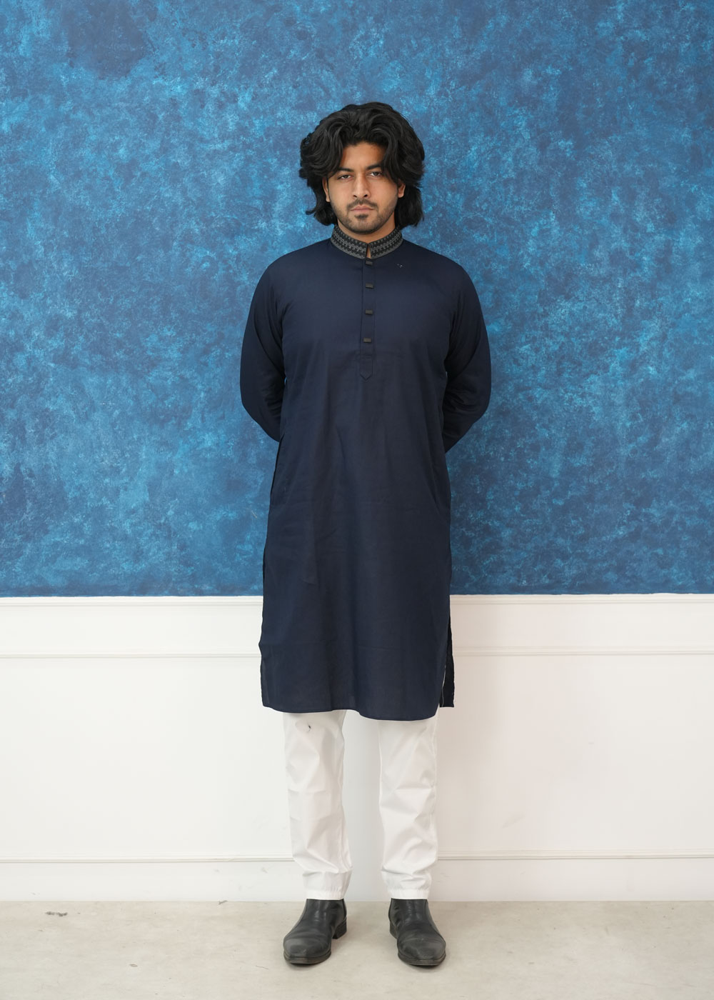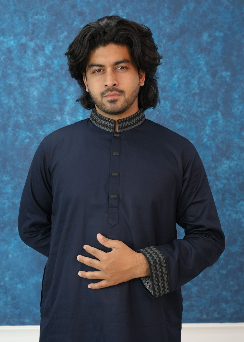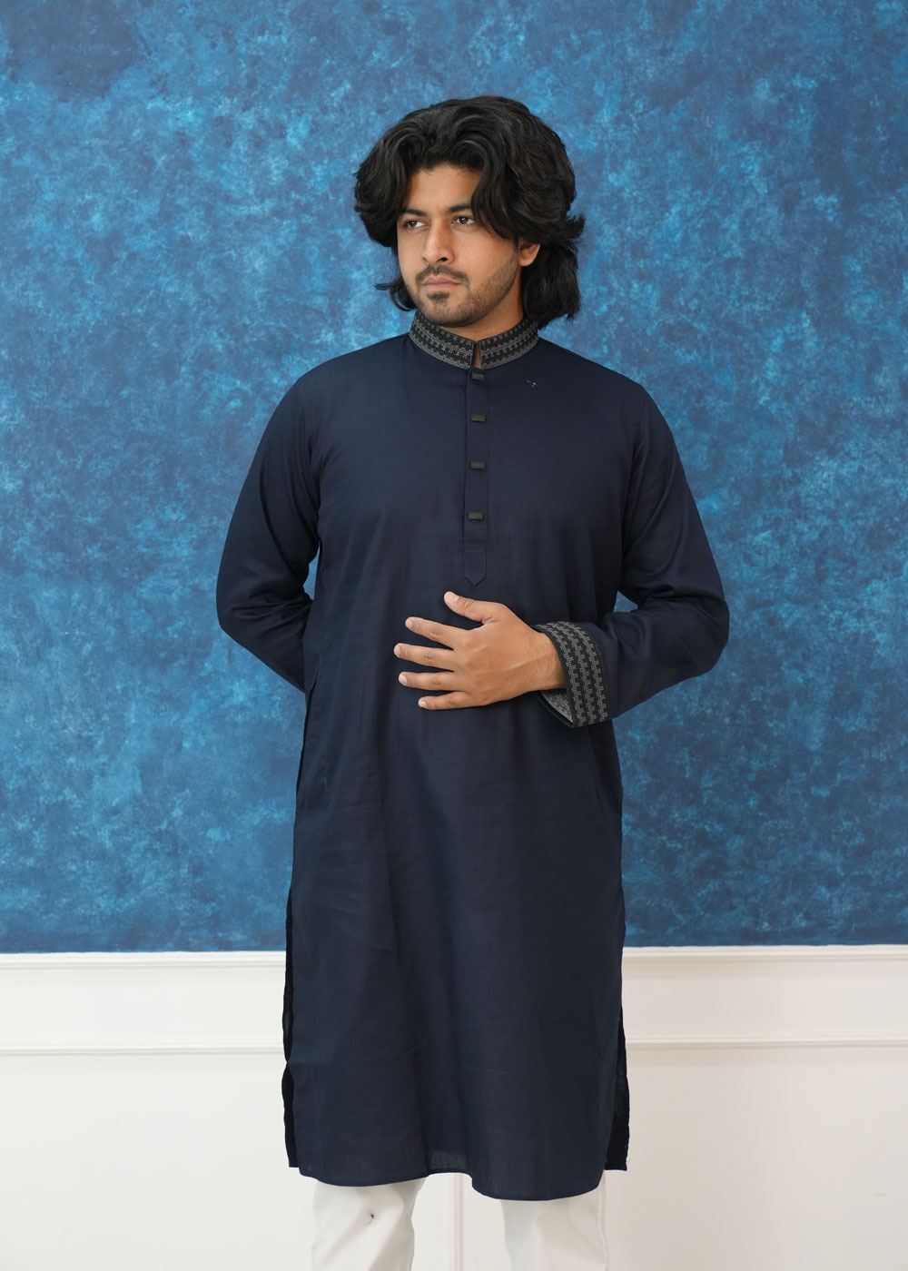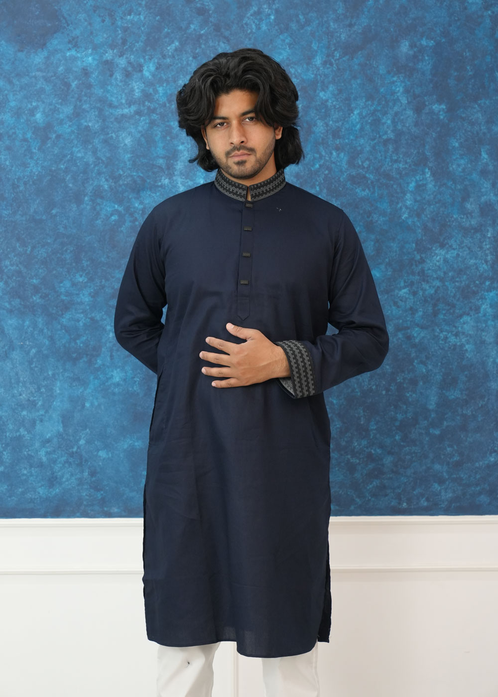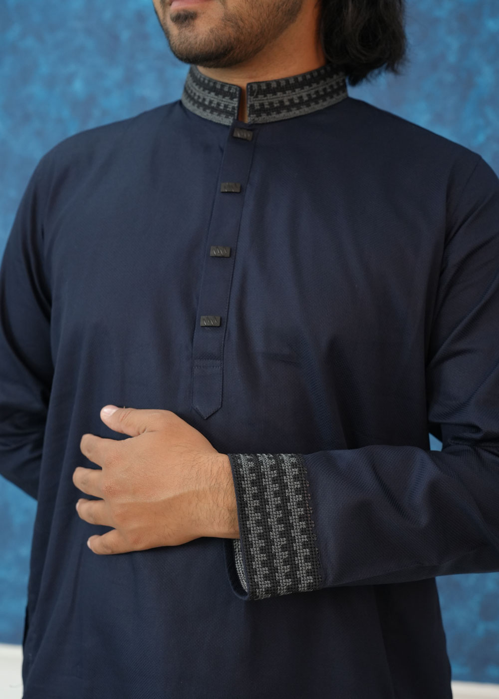 Product OverviewElevate your ethnic wardrobe with this Exquisite Navy Blue Textured Panjabi. Designed for the modern man who values tradition with a contemporary twist, this piece features a deep, midnight hue paired with sophisticated geometric detailing.Key FeaturesFabric: Crafted from a premium, breathable textured cotton blend that offers a structured look while ensuring all-day comfort.The Collar: A classic Mandarin (Band) collar adorned with intricate grey and black geometric embroidery, adding a touch of regal elegance.The Cuffs: Matching embroidered cuffs create a cohesive, high-end designer aesthetic.The Placket: Unique square-shaped decorative buttons set on a clean placket for a sharp, modern finish.Fit: Designed in a regular-fit silhouette that provides a sharp frame without compromising on movement.Style TipFor a timeless look, pair this Panjabi with white or off-white Aligarh pajamas and traditional leather Nagra shoes. For a more modern, semi-formal vibe, it works exceptionally well with fitted black trousers.OccasionPerfect for Eid celebrations, Friday prayers, wedding guest attire, or evening cultural gatherings.Technical SpecificationsFeatureDetailsColorDeep Navy BlueMaterialPremium Slub/Textured CottonSleeveFull Sleeve with Embroidered CuffsCareDry Clean Recommended or Gentle Hand Wash